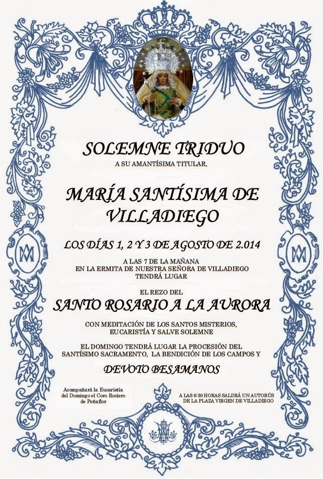 Octubre: En el mes del Rosario coincidiendo con el primer domingo la Virgen de Villadiego se despide de su pueblo con una breve procesión por el municipio pasando por el Convento de las Hermanas de la Cruz y desde allí es trasladada de regreso a su Ermita. Se celebra una novena en honor a María Santísima de Villadiego, donde tiene lugar una ofrenda de flores, besamanos a la Virgen, Función Principal de Insituto y juramento de Reglas por los hermanos.
